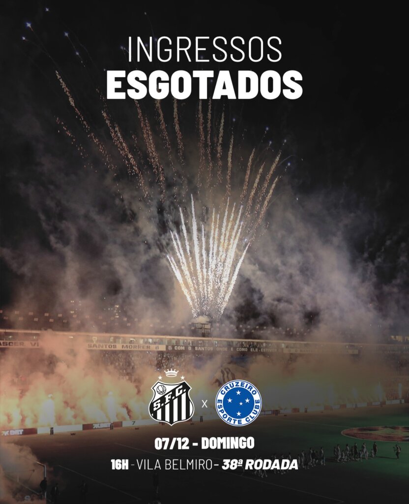 Os ingressos para o jogo Santos FC X Cruzeiro, que acontecerá no próximo domingo (07), às 16 horas, na Vila Belmiro, pelo Campeonato Brasileiro, estão esgotados. Em caso de desistência, nova carga poderá ser disponibilizada