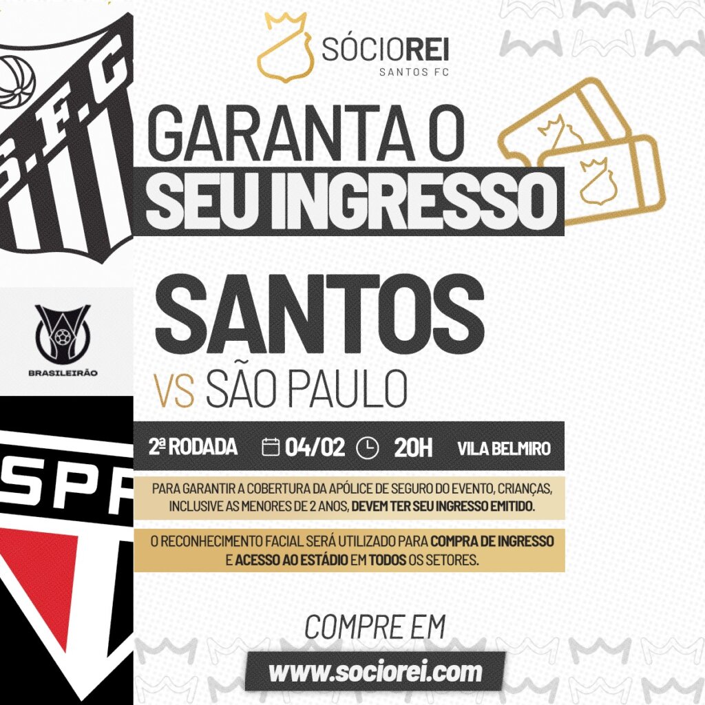 O Santos FC informa que a venda de ingressos para o jogo contra o São Paulo, na Vila Belmiro, começará neste sábado, dia 31 de janeiro, às 14h. A partida, válida pelo Campeonato Brasileiro, será realizada na quarta-feira, dia 4 de fevereiro às 20h00. Em conformidade com a Lei Estadual nº 18.159/2025, crianças de até […]