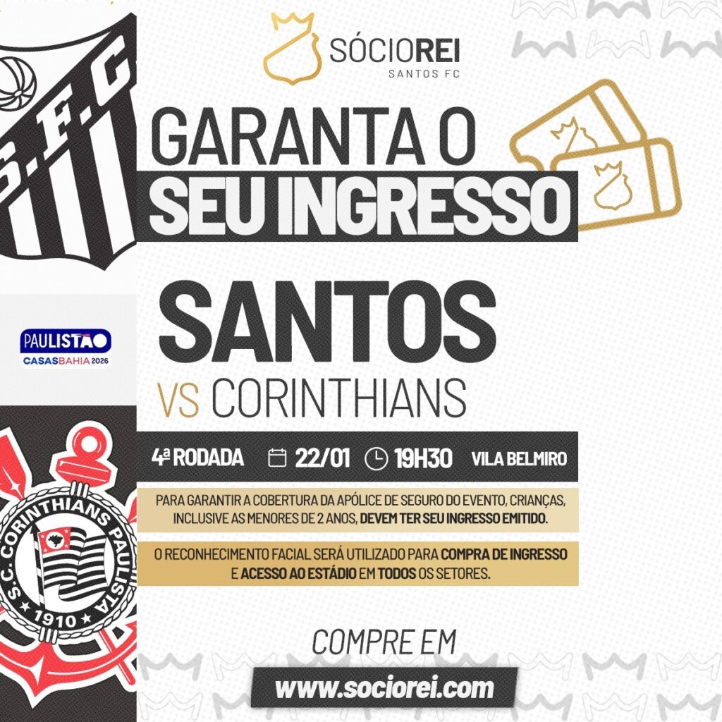 O Santos FC informa que a venda de ingressos para o jogo contra o Corinthians, na Vila Belmiro, começará neste sábado, dia 17 de janeiro, às 13h. A partida, válida pelo Campeonato Paulista, será realizada na quinta-feira, dia 22 de janeiro, às 19h30. Em conformidade com a Lei Estadual nº 18.159/2025, crianças de até 2 […]