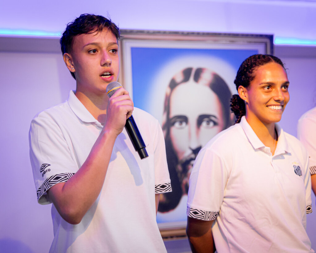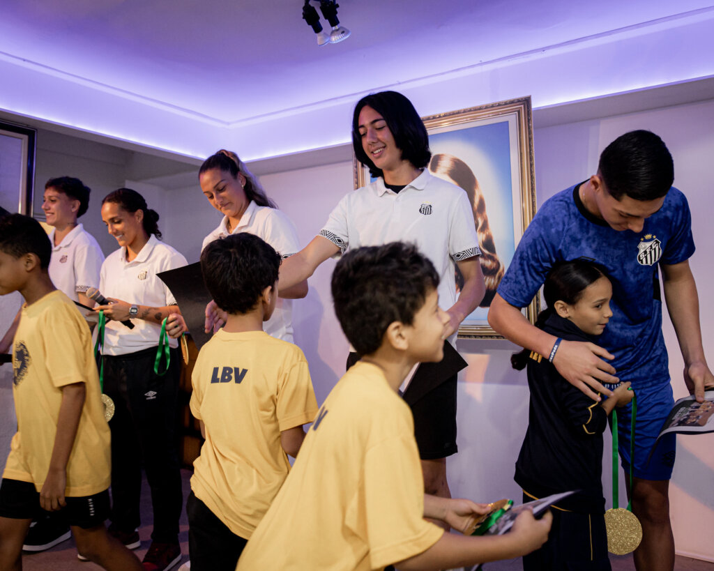Em alusão ao Dia do Goleiro, comemorado no dia 26 de abril, as goleiras Anna Rosso, Cristina Rios e Giullia Matallo, das Sereias da Vila, e os goleiros Érico Veiga, Thiago Vasconcelos e Paulo Vinícius, da categoria sub-15, participaram de uma interação com crianças e idosos atendidos pela LBV.