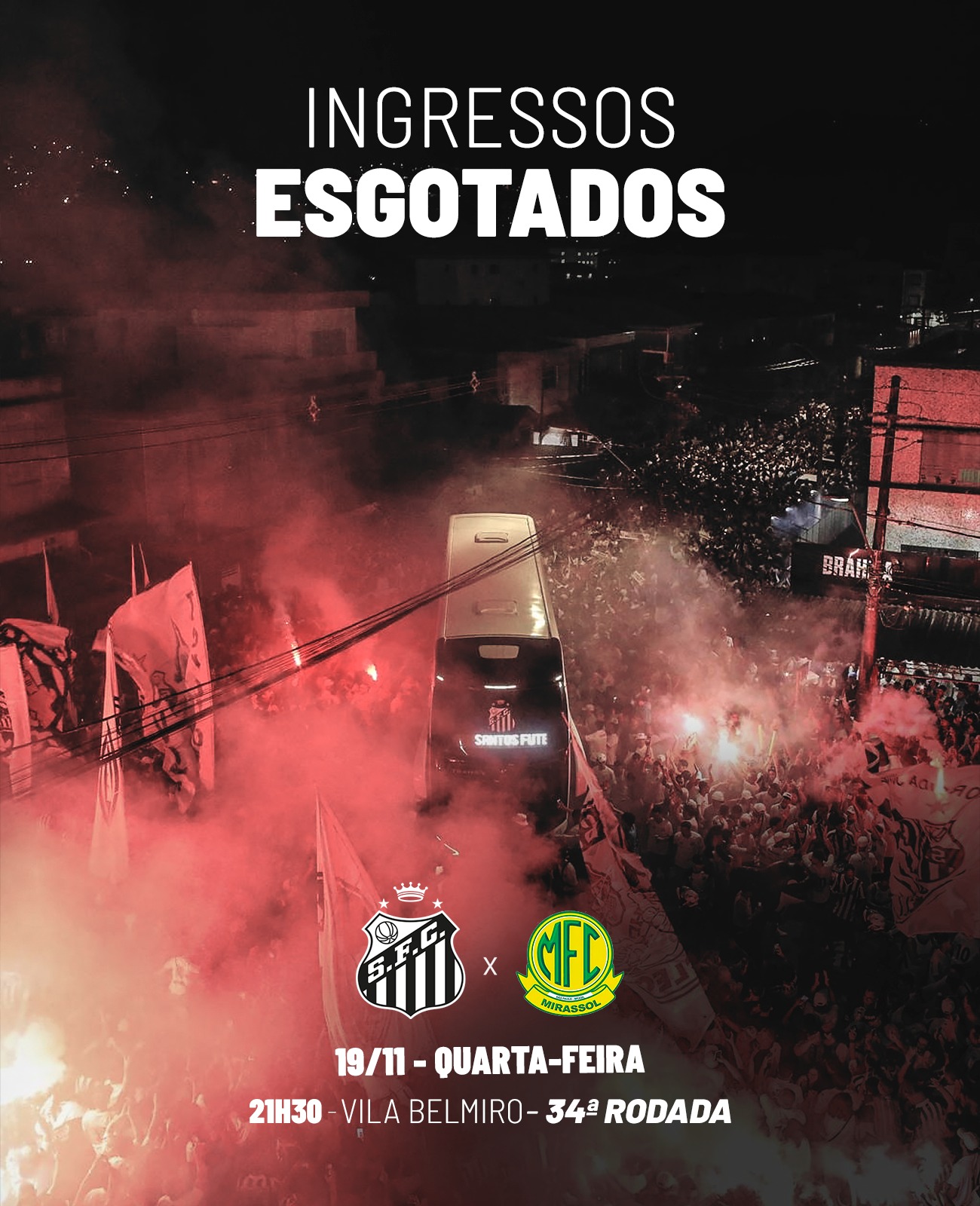 Os ingressos para a partida entre Santos FC e Mirassol, que acontecerá nesta quarta-feira (19), pelo Campeonato Brasileiro, na Vila Belmiro, estão esgotados. Em caso de desistência, nova carga poderá ser disponibilizada.