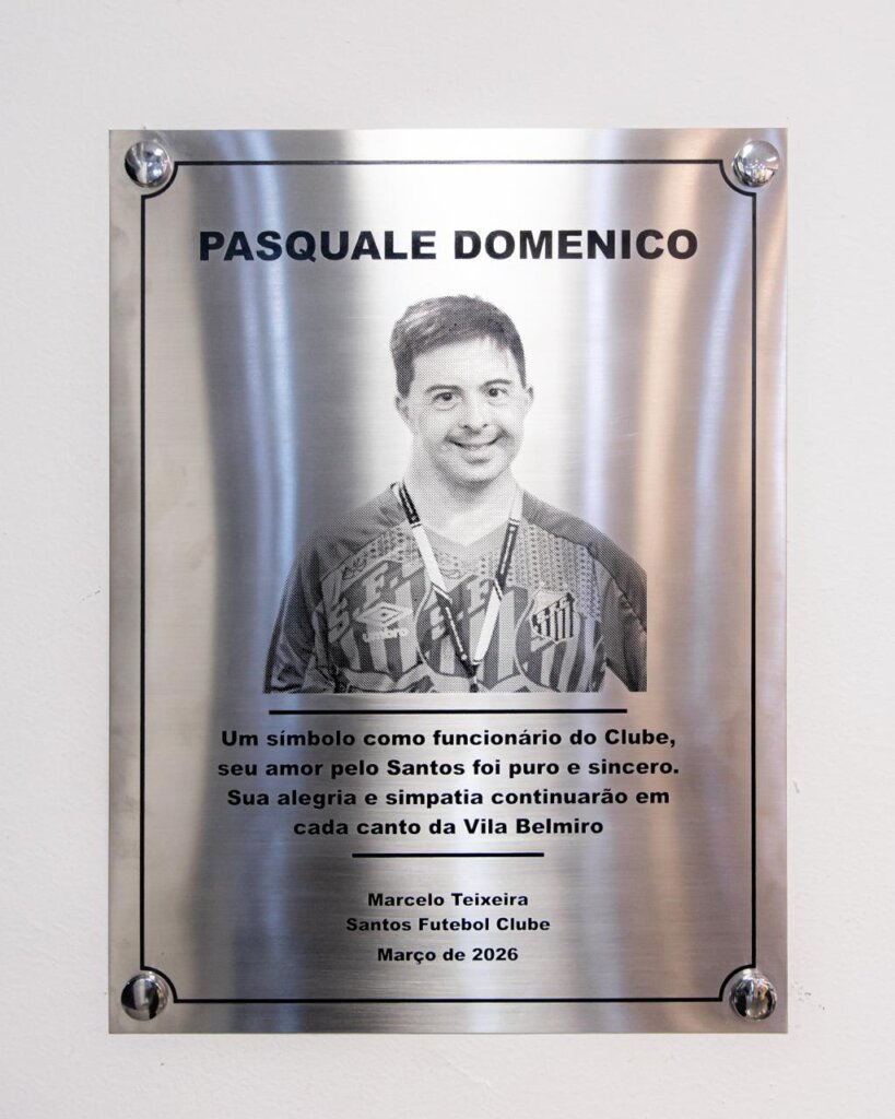 Uma manhã de sábado (21) muito especial, inesquecível e com muita emoção no Santos FC. Pasquale Domenico Nato, o querido Pasquale, primeiro funcionário com Síndrome de Down do Clube, que faleceu no dia 04 de agosto de 2025, ganhou uma placa no Memorial das Conquistas e assim está eternizado no lugar que tanto amou. Estiveram presentes a mãe, dona Josephina, os irmãos e além de outros familiares e amigos, e o presidente Marcelo Teixeira. Na data de hoje é comemorado o Dia Internacional da Síndrome de Down.