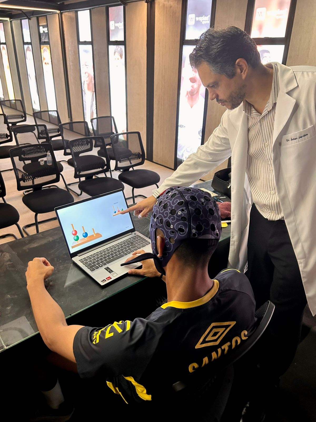 “A partir de 2026 contaremos com mais um serviço de excelência na área de saúde. Trata-se do laboratório de Neuromodulação, que será coordenado pelo especialista Ádan Jardim. Esse segmento, muito utilizado na Europa, e ainda muito raro em nosso meio, ajuda tanto na reabilitação, promovendo uma fase de recuperação mais bem aproveitada, como em treinamentos, estimulando a velocidade de decisão através de treinamentos cognitivos e por meios eletrônicos, que mimetizam situações reais de jogo como dribles chutes ou passes“ afirma o Dr. Rodrigo Zogaib, Coordenador Médico e da Área de Saúde do Santos FC.