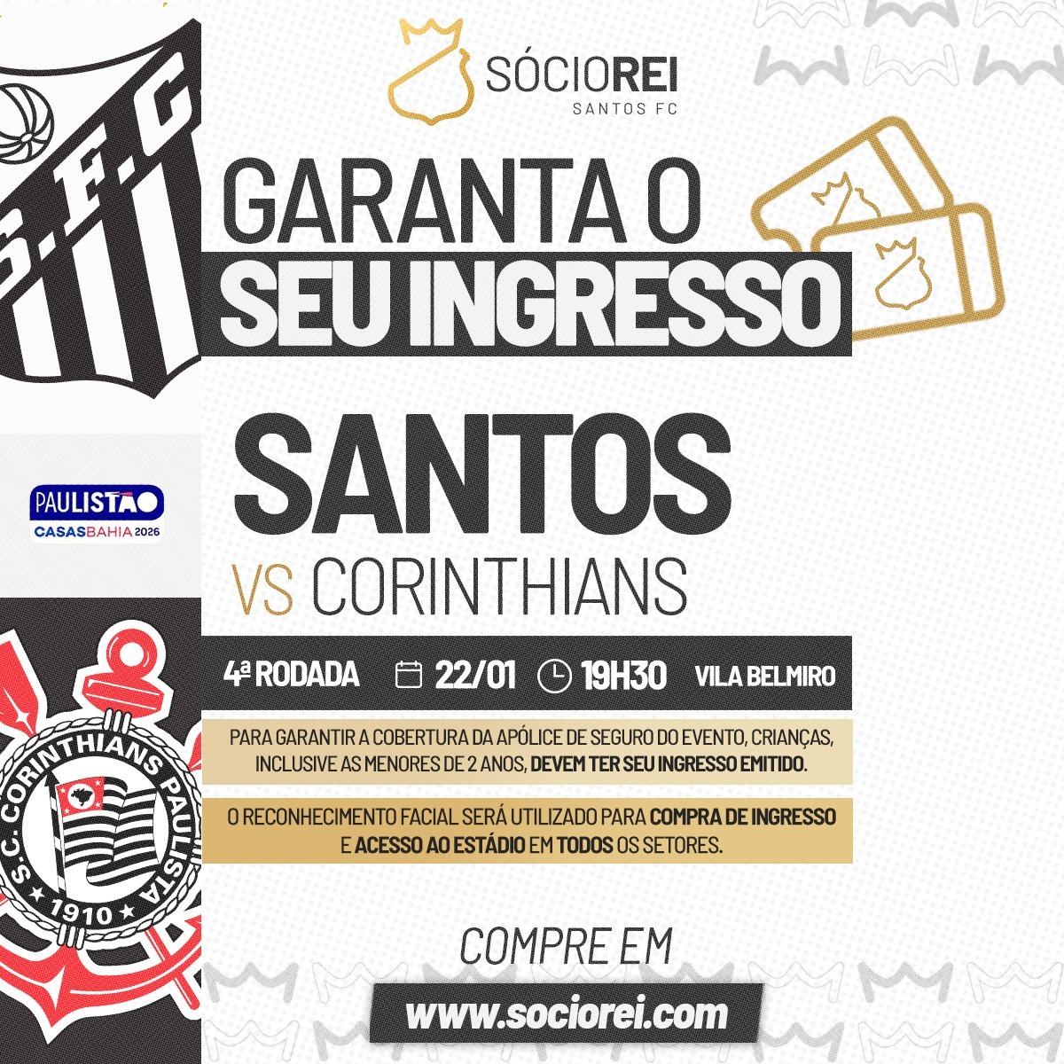 O Santos FC informa que a venda de ingressos para o jogo contra o Corinthians, na Vila Belmiro, começará neste sábado, dia 17 de janeiro, às 13h. A partida, válida pelo Campeonato Paulista, será realizada na quinta-feira, dia 22 de janeiro, às 19h30.
