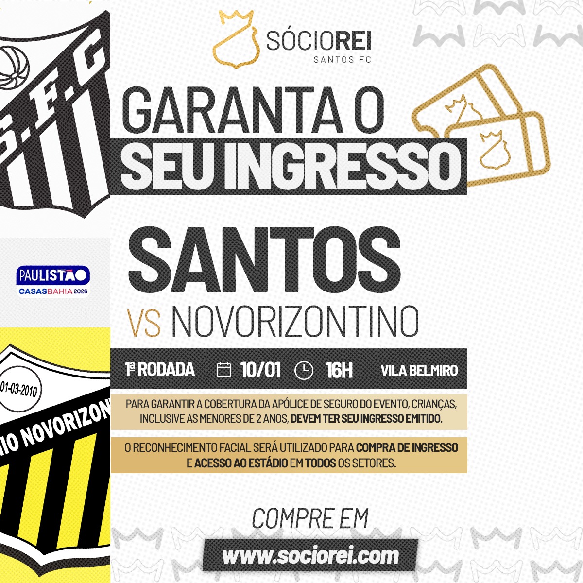 O Santos FC informa que a venda de ingressos para o jogo contra o Novorizontino, na Vila Belmiro, começará nesta segunda-feira, dia 5. A partida, válida pelo Campeonato Paulista, será realizada no sábado, dia 10 de janeiro, às 16h. A Lei Estadual nº 18.159/2025, de São Paulo, garante gratuidade em eventos esportivos para crianças de até 2 anos incompletos, que devem permanecer no colo do responsável. Não há gratuidade para idosos ou pessoas com deficiência.