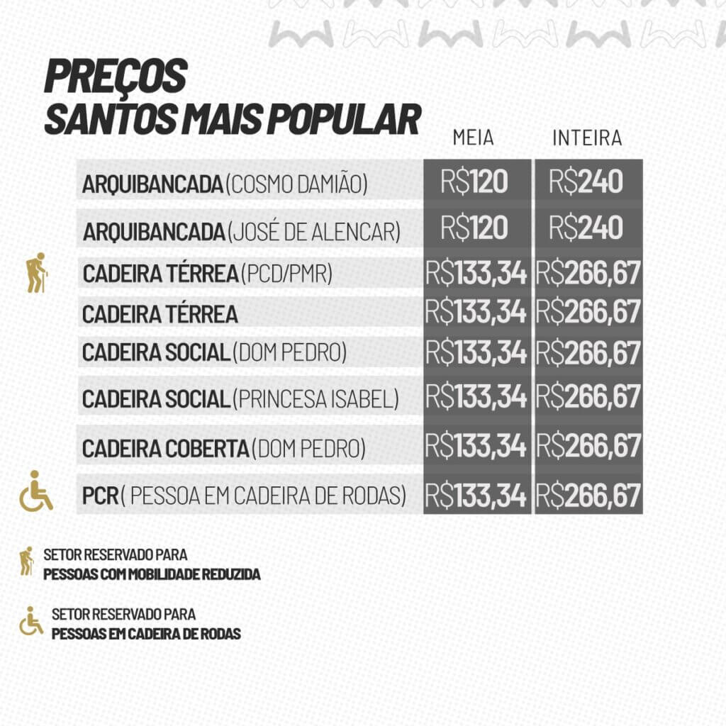 O Santos FC informa que a venda de ingressos para o jogo contra o Remo, na Vila Belmiro, começará nesta quinta-feira, dia 26. A partida, válida pelo Campeonato Brasileiro, será realizada na quinta-feira, dia 2 de abril, às 19h. A Lei Estadual nº 18.159/2025, de São Paulo, garante gratuidade em eventos esportivos para crianças de até 2 anos incompletos, que devem permanecer no colo do responsável. Não há gratuidade para idosos ou pessoas com deficiência.