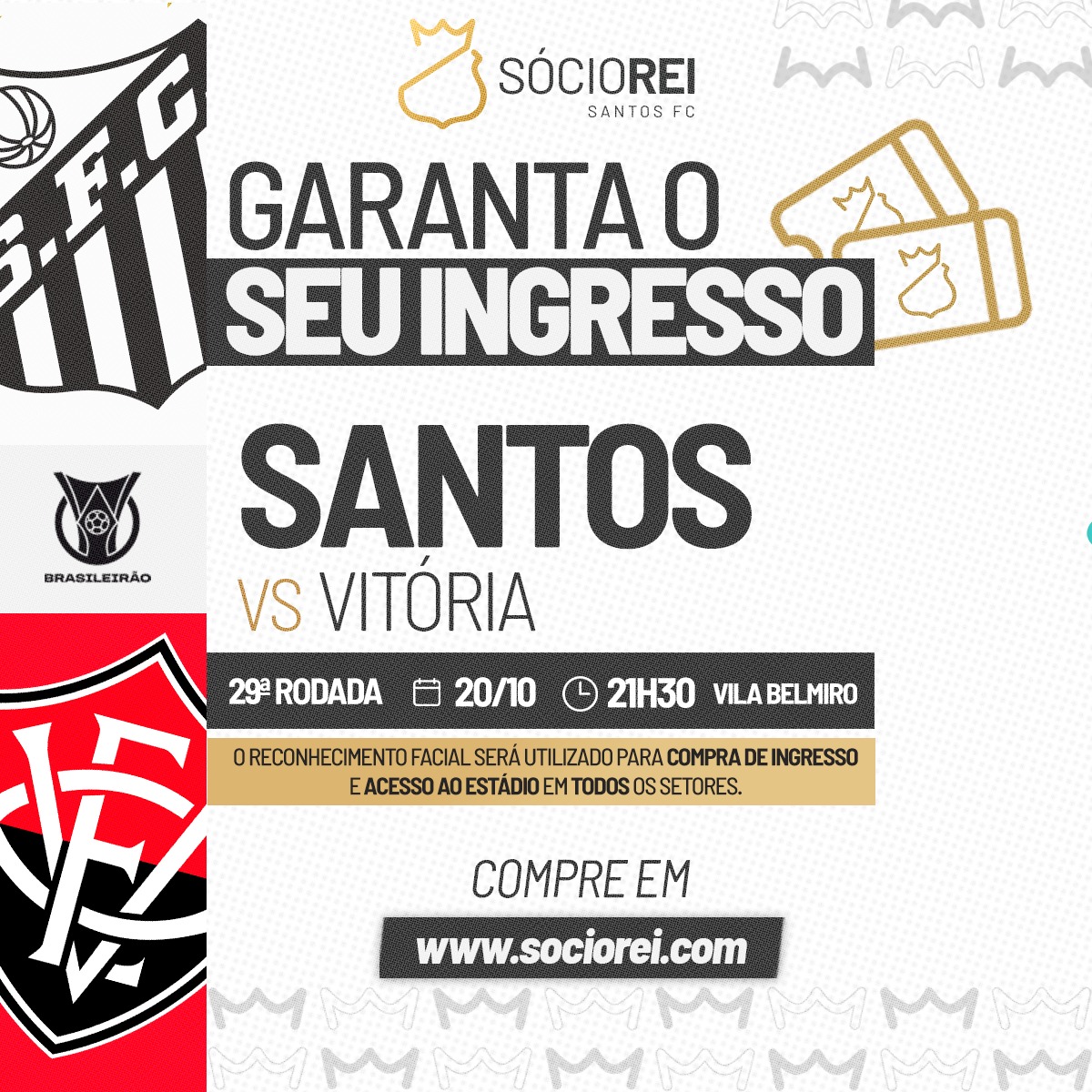 O Santos FC informa que a venda de ingressos para o jogo contra o Vitória, na Vila Belmiro, começa nesta quinta-feira, dia 16. A partida, válida pela 29ª rodada do Campeonato Brasileiro, será realizada na segunda-feira, dia 20 de outubro, às 21h30. A Lei Estadual nº 18.159/2025, de São Paulo, garante gratuidade em eventos esportivos para crianças de até 2 anos incompletos, que devem permanecer no colo do responsável. Não há gratuidade para idosos ou pessoas com deficiência.
