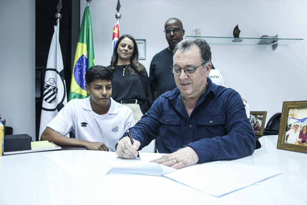 O volante Mateus Mendes, de 16 anos, assinou o primeiro contrato profissional com o Santos FC. O novo compromisso do atleta é válido até 31 de março de 2028. O antigo vínculo, de formação, era válido até fevereiro de 2026.